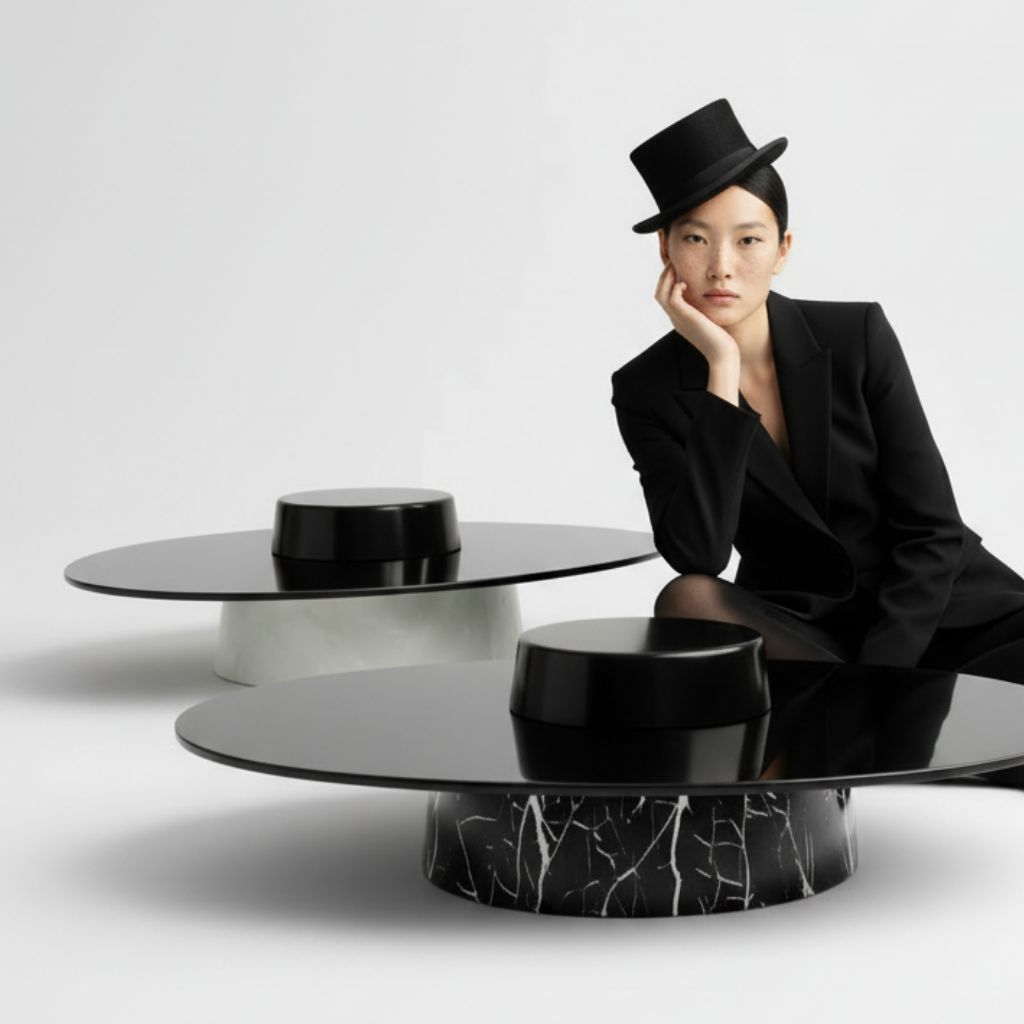 CARMEN incarne une élégance maîtrisée, où la simplicité devient manifeste. Sa silhouette ample et parfaitement contrôlée semble suspendue dans l’espace, comme un disque noir en lévitation au-dessus d’une base lumineuse et arrondie. Le plateau, d’une brillance profonde, capte et reflète son environnement avec une précision presque liquide. Il contraste subtilement avec le socle cylindrique, plein et minéral, qui ancre la pièce dans une stabilité silencieuse.