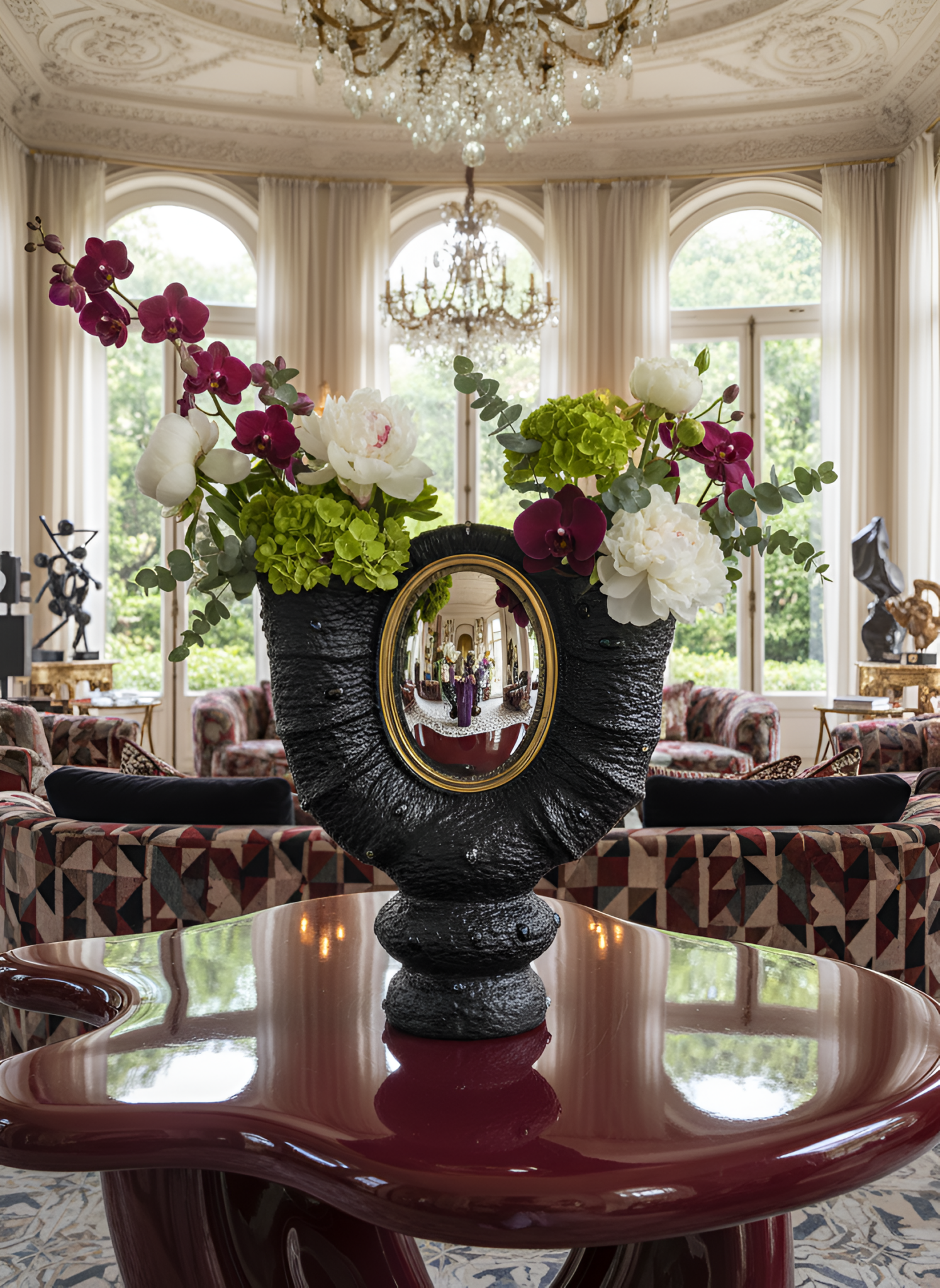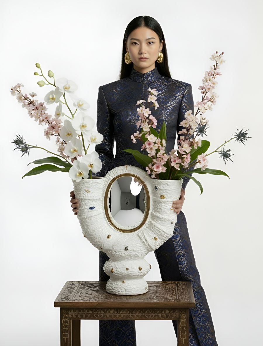 Au centre, un miroir ovale  agit comme un cœur lumineux. Il capte les couleurs des bouquets, reflète leur mouvement et prolonge leur présence dans l’espace. LUMEN transforme ainsi chaque arrangement floral en un rituel visuel : un dialogue entre reflet, volume et nature.
