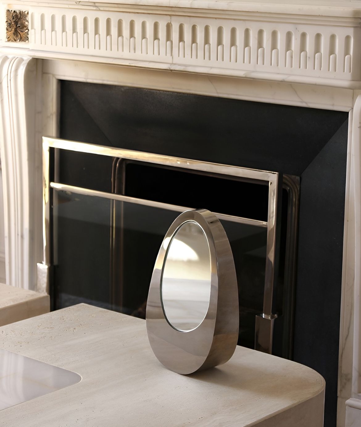 OVIO révèle une double nature. Une face en acier inoxydable poli miroir capte la lumière avec une clarté intense. L’autre face dévoile la profondeur minérale de l’onyx, mise en valeur par un verre subtil qui en révèle les nuances.